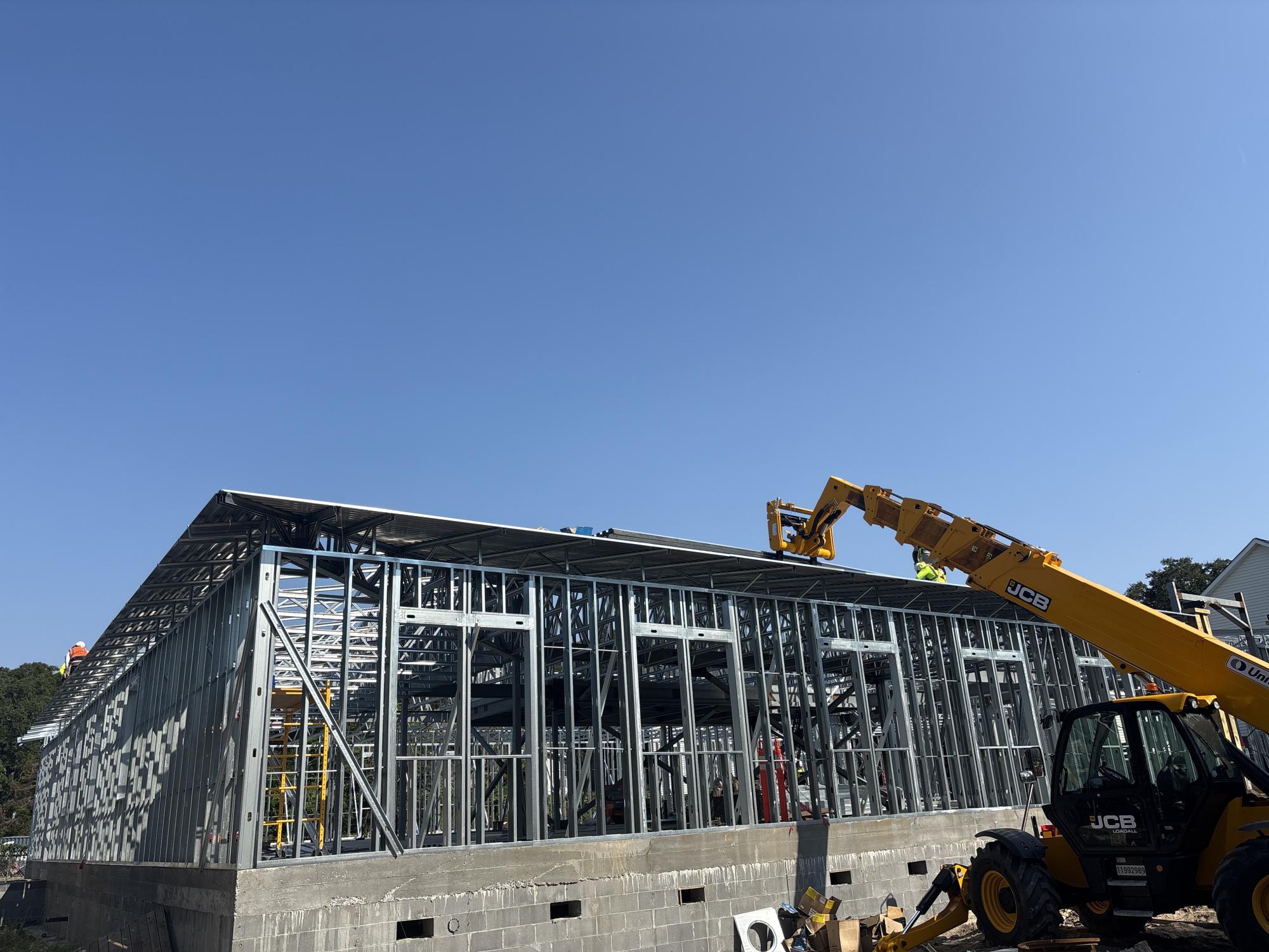 The building foundation has been installed, roofing work is currently underway, and the underground drainage system in the parking lot extension area is installed. The project remains on schedule and within budget.